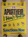 Text: Apartheid, I Won't Buy It, Sanctions Now, A Communist Party poster